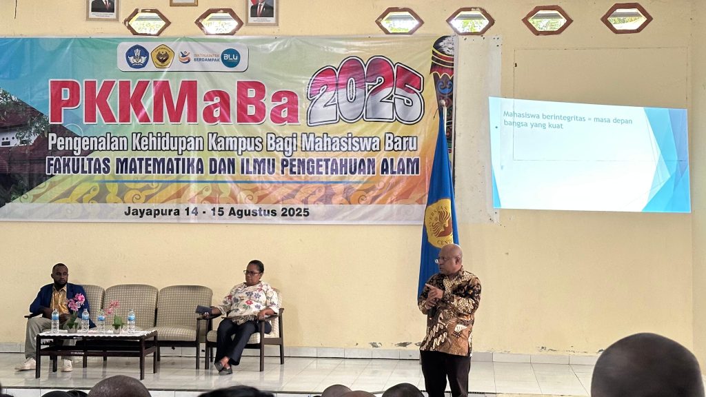 Jayapura, 14 Agustus 2025  Suasana penuh semangat menyelimuti pembukaan Pengenalan Kehidupan Kampus bagi Mahasiswa Baru (PKKMB) 2025 di Fakultas Matematika dan Ilmu Pengetahuan Alam (FMIPA) Universitas Cenderawasih (Uncen). Pada kesempatan ini, Dekan FMIPA, Dr. Jonathan K. Wororomi, M.Si., menegaskan komitmen fakultas dalam membangun Zona Integritas (ZI) dengan mengangkat tema “Mahasiswa Berintegritas, Kampus Berkualitas” sebagai landasan utama dalam mendidik generasi penerus bangsa. Dalam paparannya, Dr. Jonathan K. Wororomi, M.Si., menjelaskan bahwa Zona Integritas merupakan upaya bersama untuk menciptakan lingkungan kampus yang bebas dari korupsi, dengan tata kelola yang jujur, transparan, dan mengutamakan pelayanan prima. Melalui penerapan ZI, FMIPA Uncen bertekad membangun budaya anti korupsi, meningkatkan kualitas pelayanan publik, mendorong transparansi serta akuntabilitas, dan menanamkan karakter berintegritas di setiap aspek kehidupan akademik.